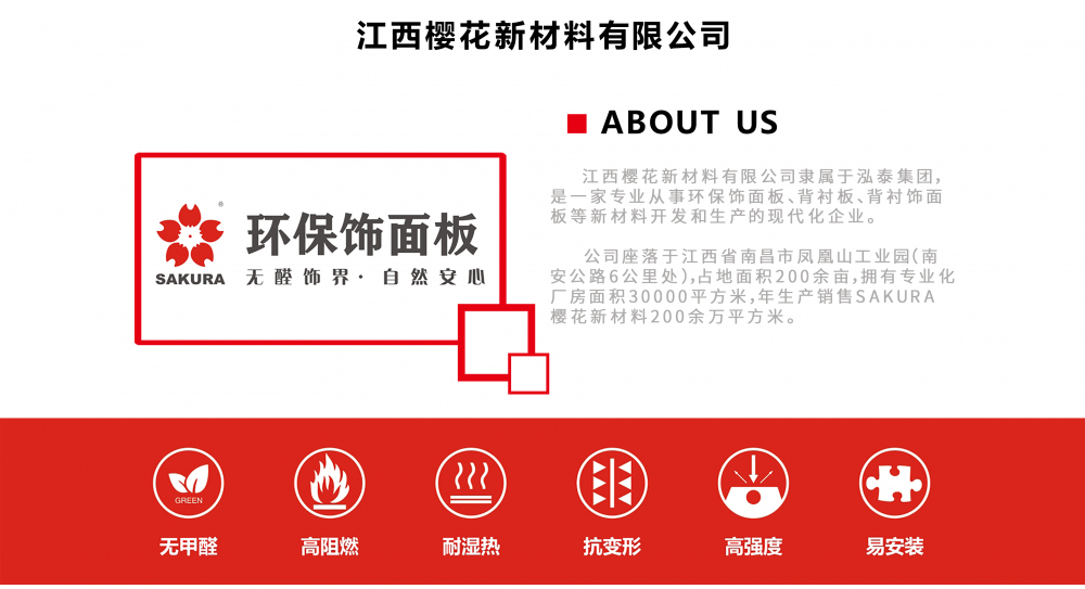 公司配备先进水平的化成、涂装和复合板生产设备,遵循“不合格原材料不使用,不合格过程产品不转序,不合格最终产品不出厂“的质量“三不”原则。产品经国家建筑材料测试中心检测,全部指标达到或超过相关标准。 长期以来,公司与研究机构建立技术合作,密切注视相关新材料发展的新动向,致力于拓展新材料产品的延伸应用。SAKURA樱花建立了全国的销售网络,与开发商、装饰公司、设计院所、石油、电力、电信、银行等多个行业建立了战略合作关系。 执着的追求,挚诚的服务,美好明天期待我们携手共创!